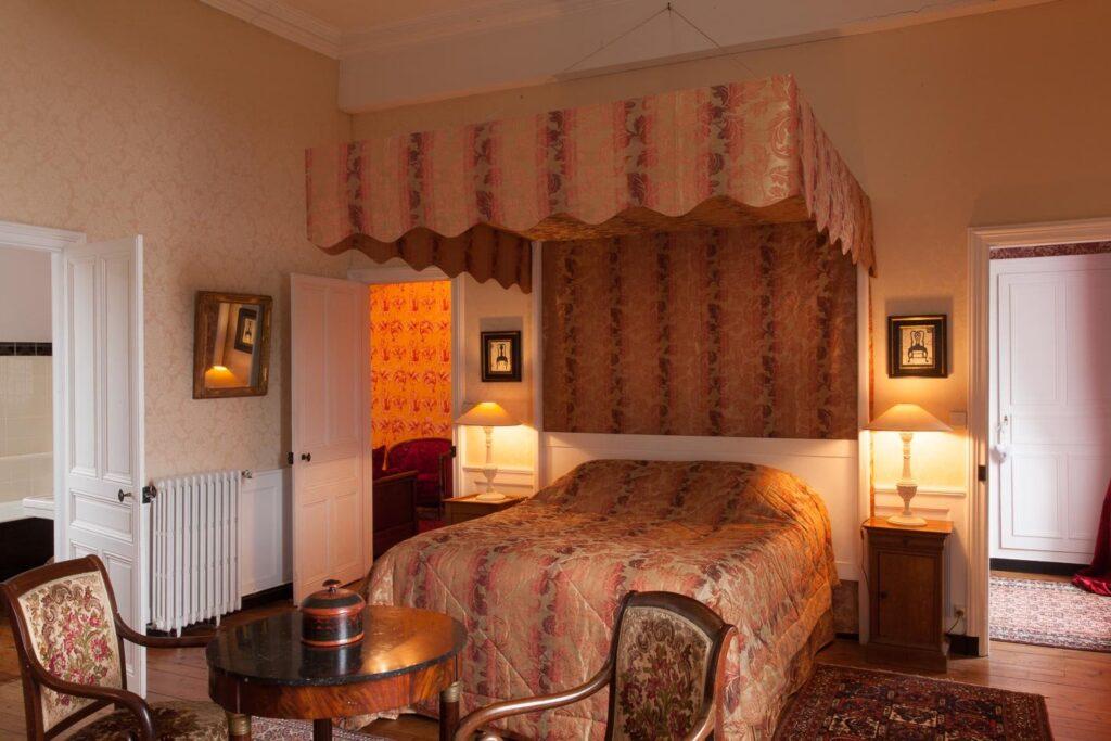 Située au premier étage du château avec une vue exceptionnelle sur les jardins en terrasse. Un grand lit à baldaquin et 2 lits séparés dans chambres communicantes.
